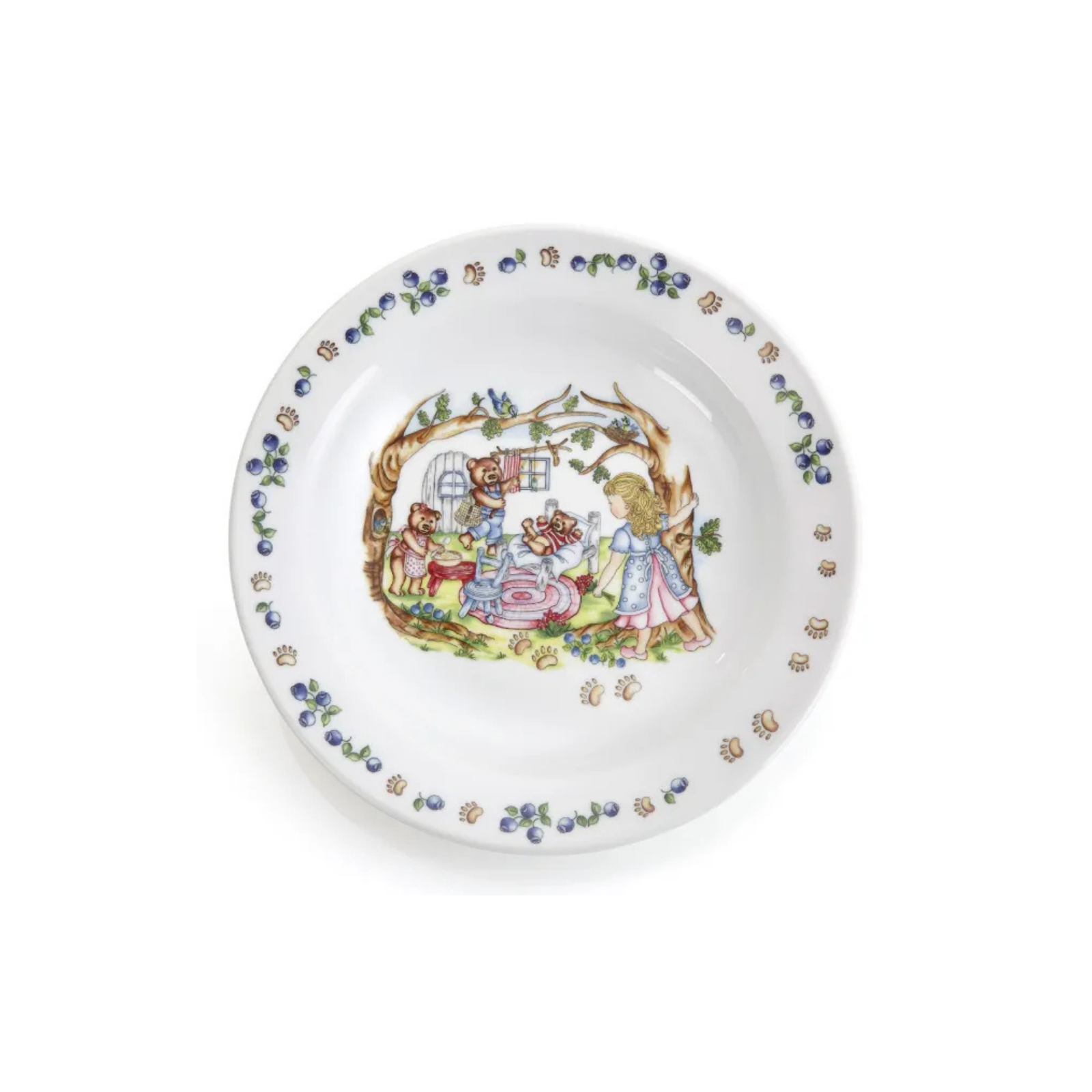 Grøtskål i porselen med detaljrikt motiv fra eventyret om Gullhår og de tre små bjørner.
