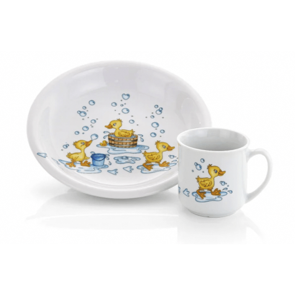 Porselenssett i to deler. Består av grøtskål og krus. Tåler oppvaskmaskin.