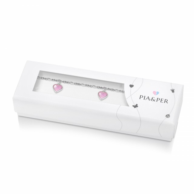 Vakkert og klassisk charms-armbånd med tre nydelige hjerter laget av 925 sølv og belagt med rosa glassemalje.