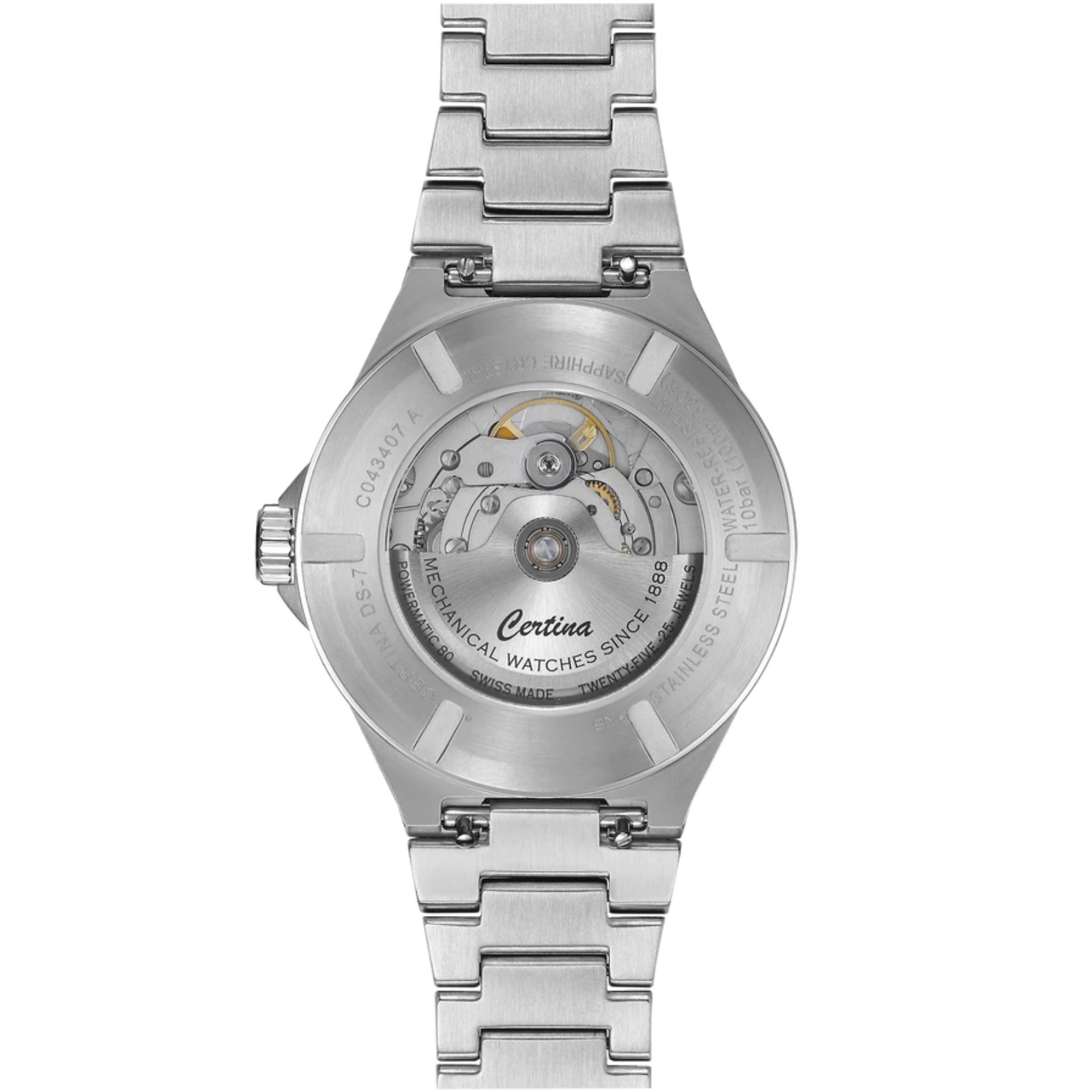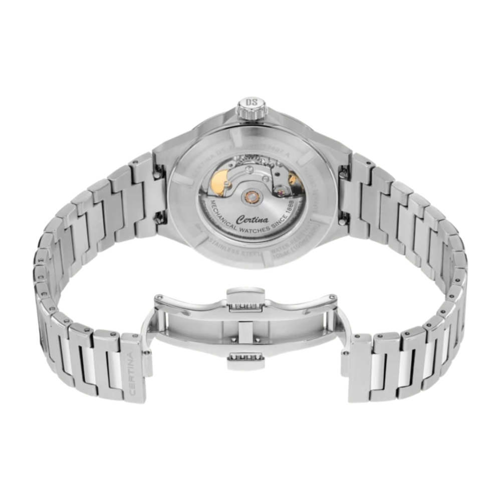 Den 39 mm store kassen i rustfritt stål og safirglass med antirefleksbelegg sikrer robusthet og perfekt lesbarhet. Med Certina sitt ikoniske DS (Double Security)-konsept har klokken en vanntetthet på opptil 100 meter.