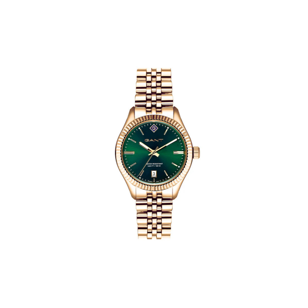 Elegant og tidløs Gant Sussex Dameklokke med gullfarget stålkasse (34 mm) og gullfarget stållenke i klassisk design. Denne populære dameklokken fra Gant har en klar grønn urskive, mineralglass og datovisning ved kl. 6, og tilbyr høy presisjon med quartz–urverk.