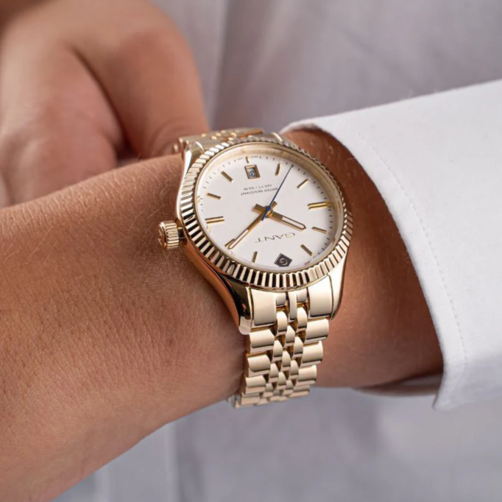 Den perfekte mellomstore klokken for hverdagsbruk og festlige anledninger. Denne modellen har en gullfarget lenke og hvit urskive med datovisning klokken 6. Den er vanntett til 50 meter.