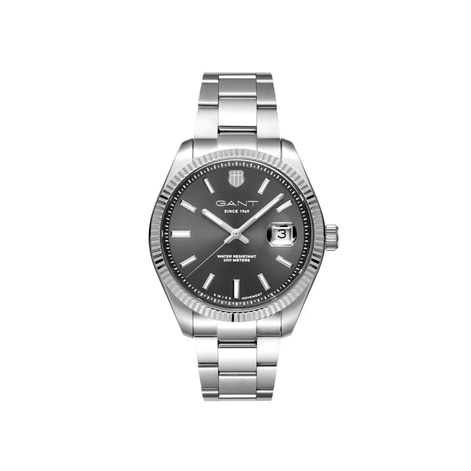 Denne modellen har en elegant 3-ledds lenke i rustfritt stål og en moderne grå urskive med datovisning og sølvfargede indekser. Et ripefritt safirglass beskytter urskiven og gir tydelig og klar avlesning år etter år. Klokken er vanntett til 10 ATM.