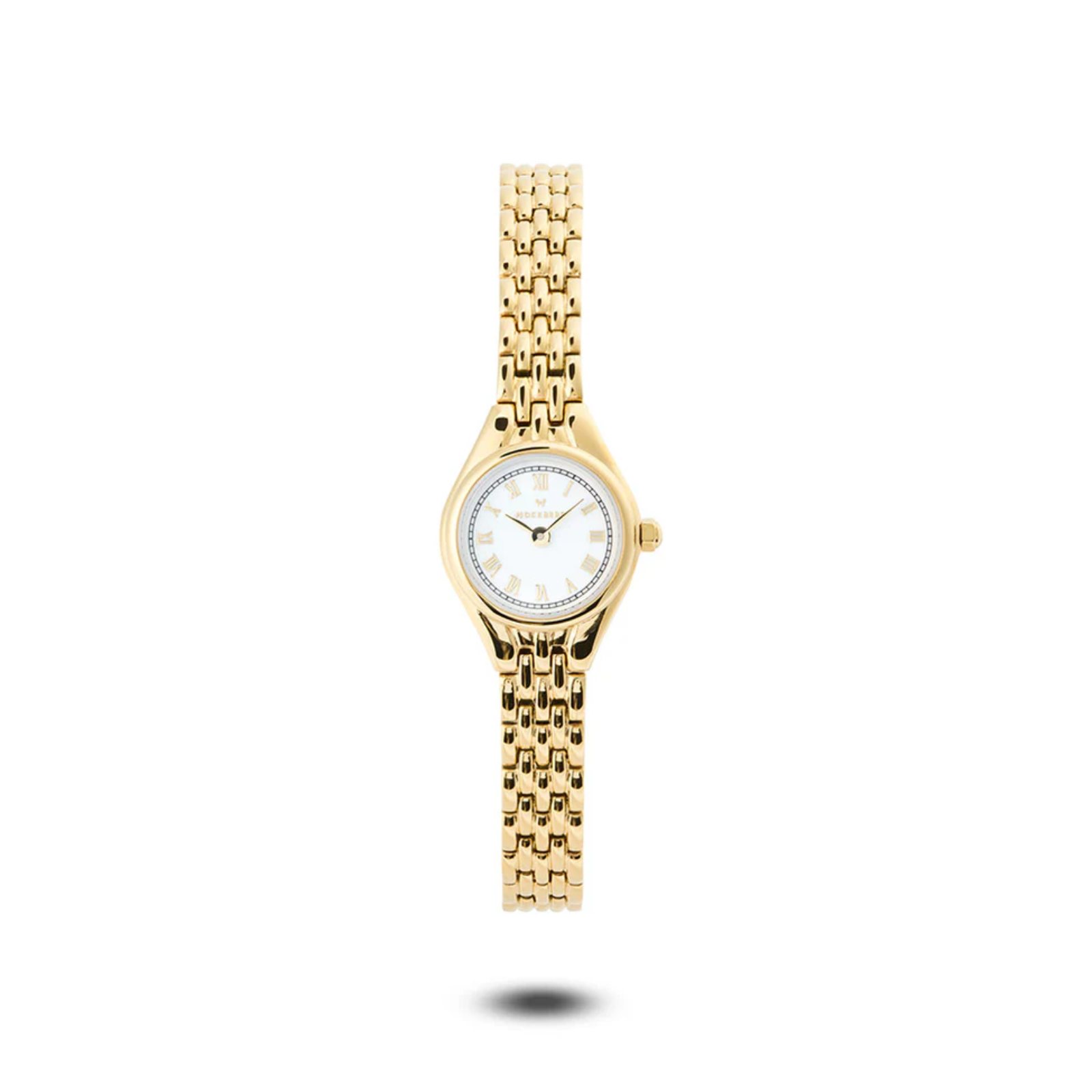 Klokken har en hvit urskive med romerske tall, ripe- og støtsikkert mineralglass og et slankt lenkearmbånd i gullfarget rustfritt stål.