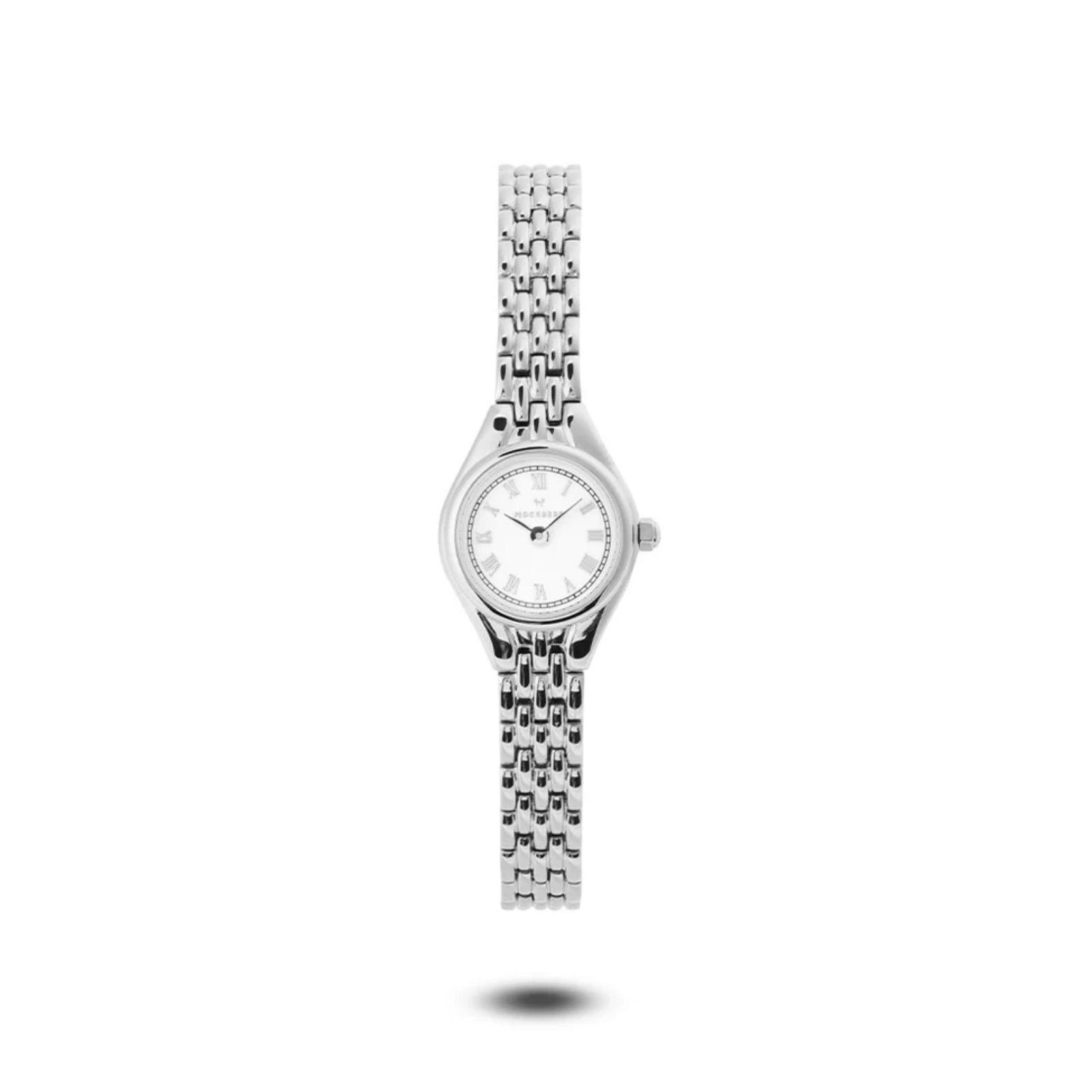 Klokken har en hvit urskive med romerske tall, ripe- og støtsikkert mineralglass og et slankt lenkearmbånd i rustfritt stål.