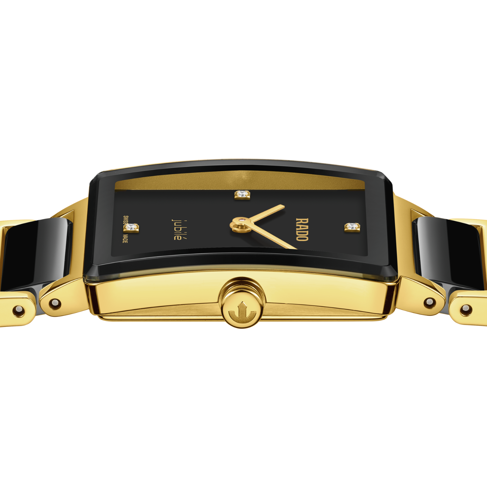 Rado Integral er en elegant og tidløs klokke for deg som setter pris på eksklusiv, minimalistisk design. Denne modellen har den klassiske Rado-detaljen med fire diamanter på urskiven, og en sort lakkert skive med gule Rado- og jubilé-logoer.