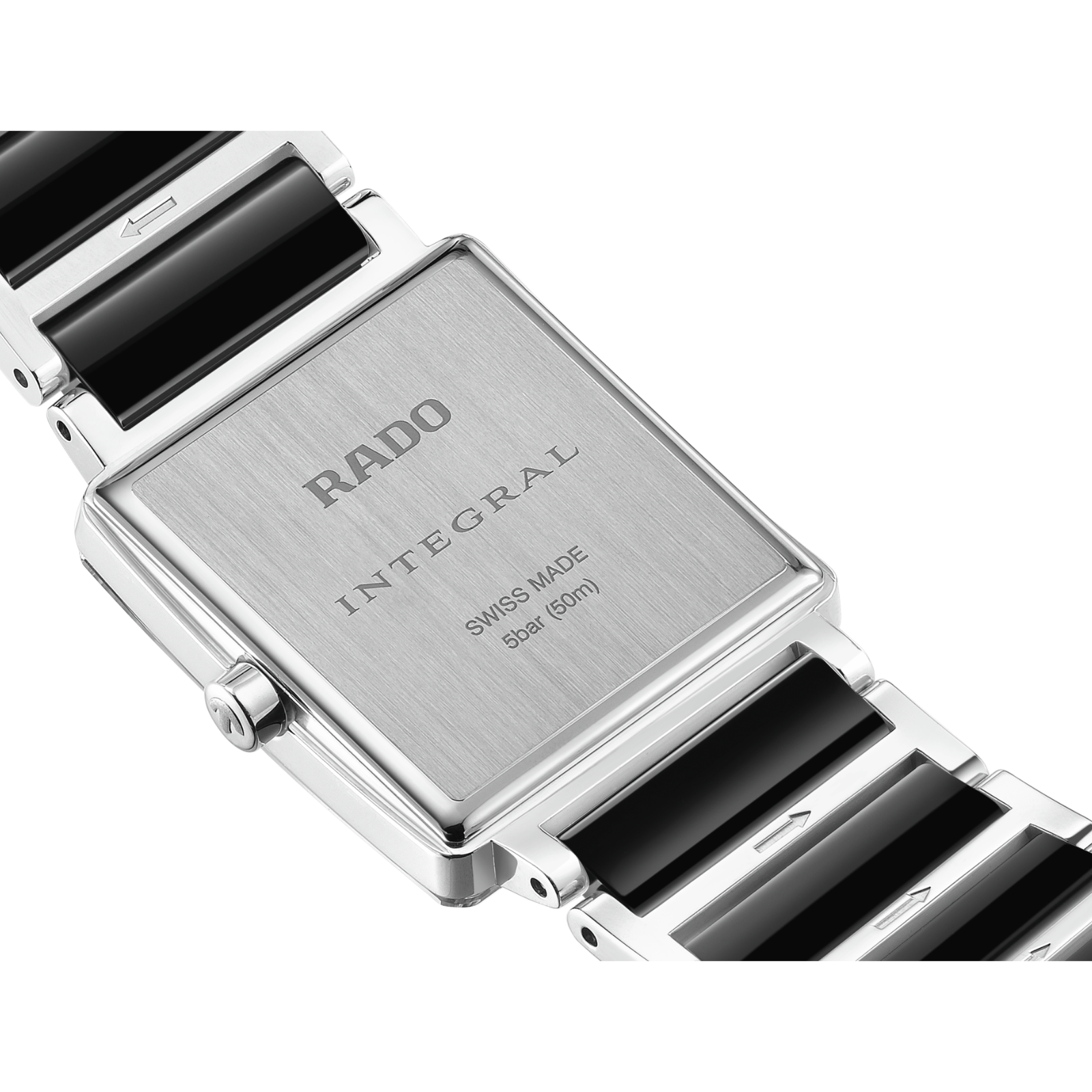 Rado Integral er en klassisk og elegant klokke som kombinerer tidløs design med moderne materialer. Den har en minimalistisk svart urskive med rhodiumbelagte visere og fire diamanter plassert ved klokken 12, 3, 6 og 9, som gir et subtilt luksuspreg.