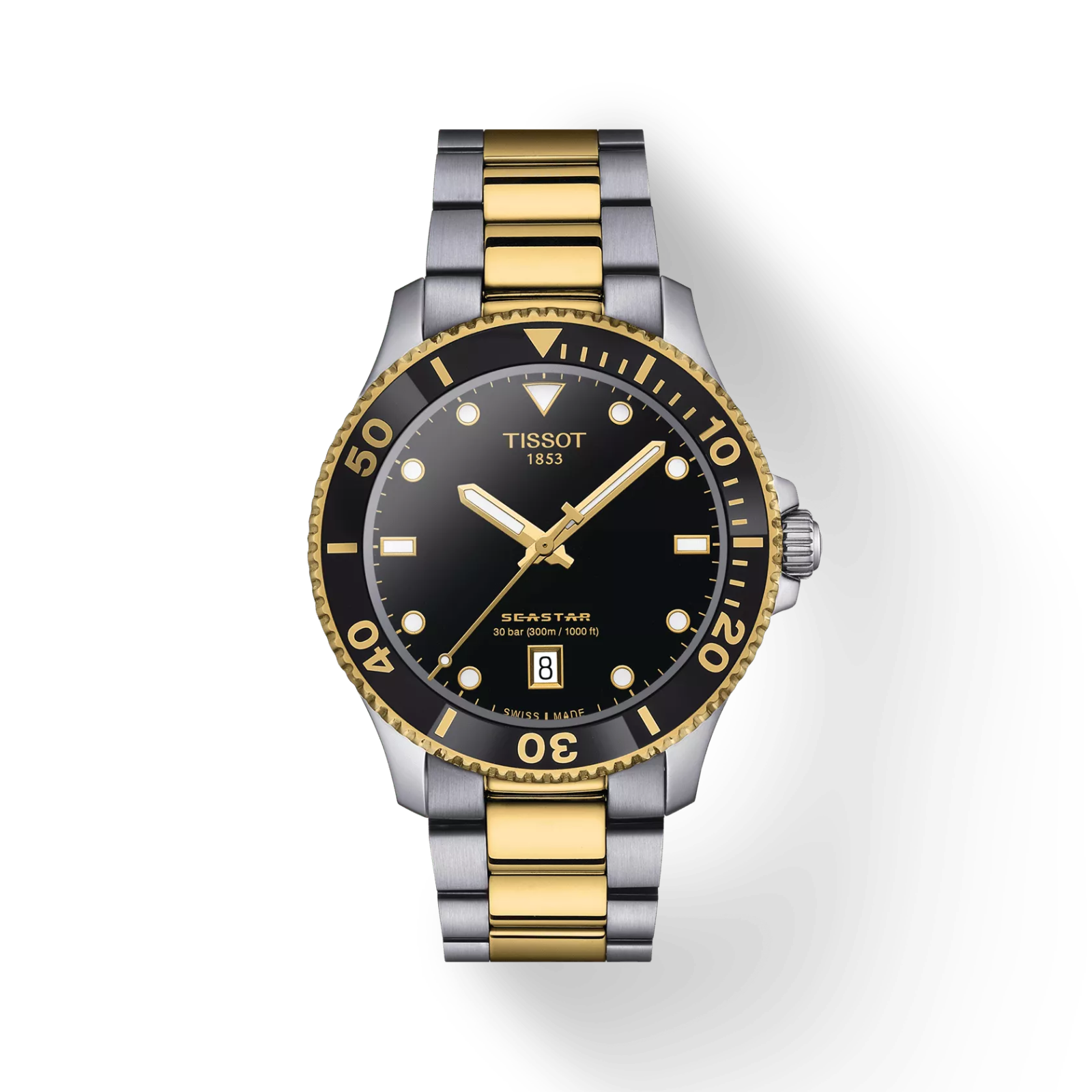 Denne Tissot Seastar 1000 40 mm-modellen har en tofarget bezel i sort med gulldetaljer i PVD-belegg rundt kanten. Den tofargede lenken i 316L rustfritt stål har også guldfarget PVD-belegg, og er utstyrt med quick-release-system for enkel utskifting.
