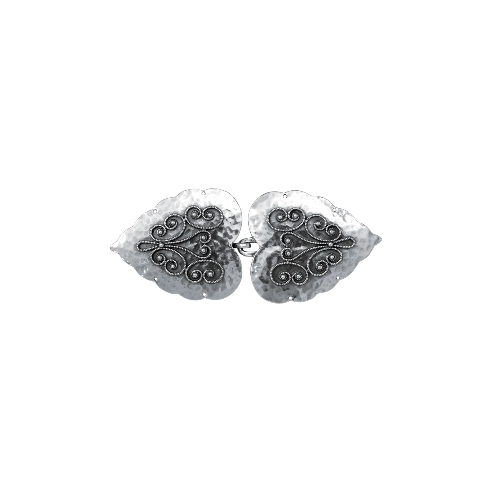 Hjerteformet beltespenne i støpt og oksidert sølv til Rogalandsbunaden. Den har en hamret overflate og flott filigrandekor som gir et tradisjonelt og dekorativt uttrykk. Spennen monteres på svart skinnlist og er typisk brukt til Rogalandsbunaden.