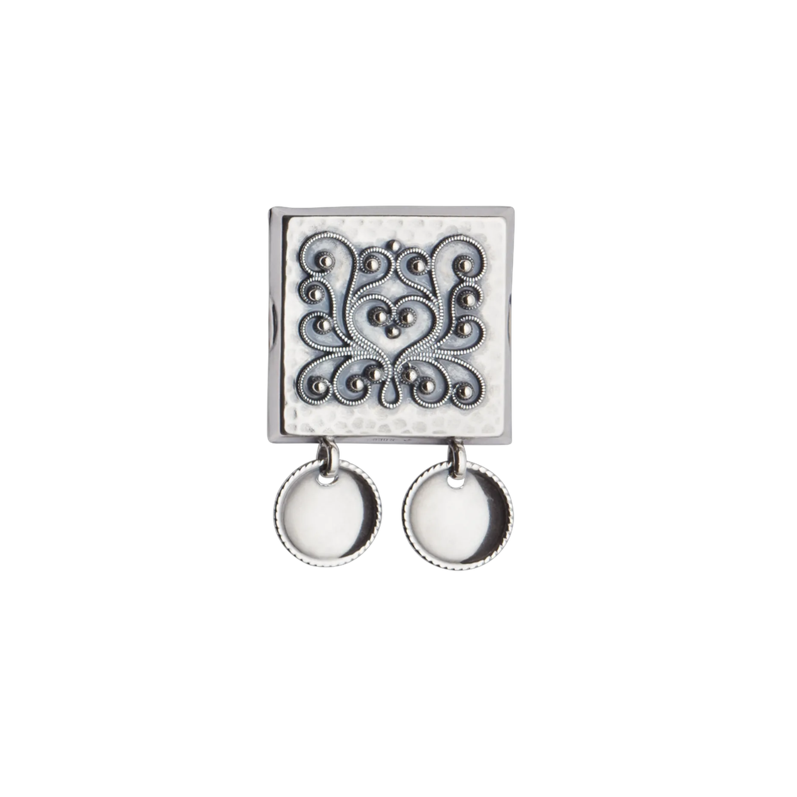 Denne beltestølen er mye brukt i Rogaland. Den er i oksidert sølv med trådkantlauv og påloddet filigran, og monteres på svart skinnlist. For et komplett belte trenger du også beltespenne og eventuelt veskestøl og knivstøl.