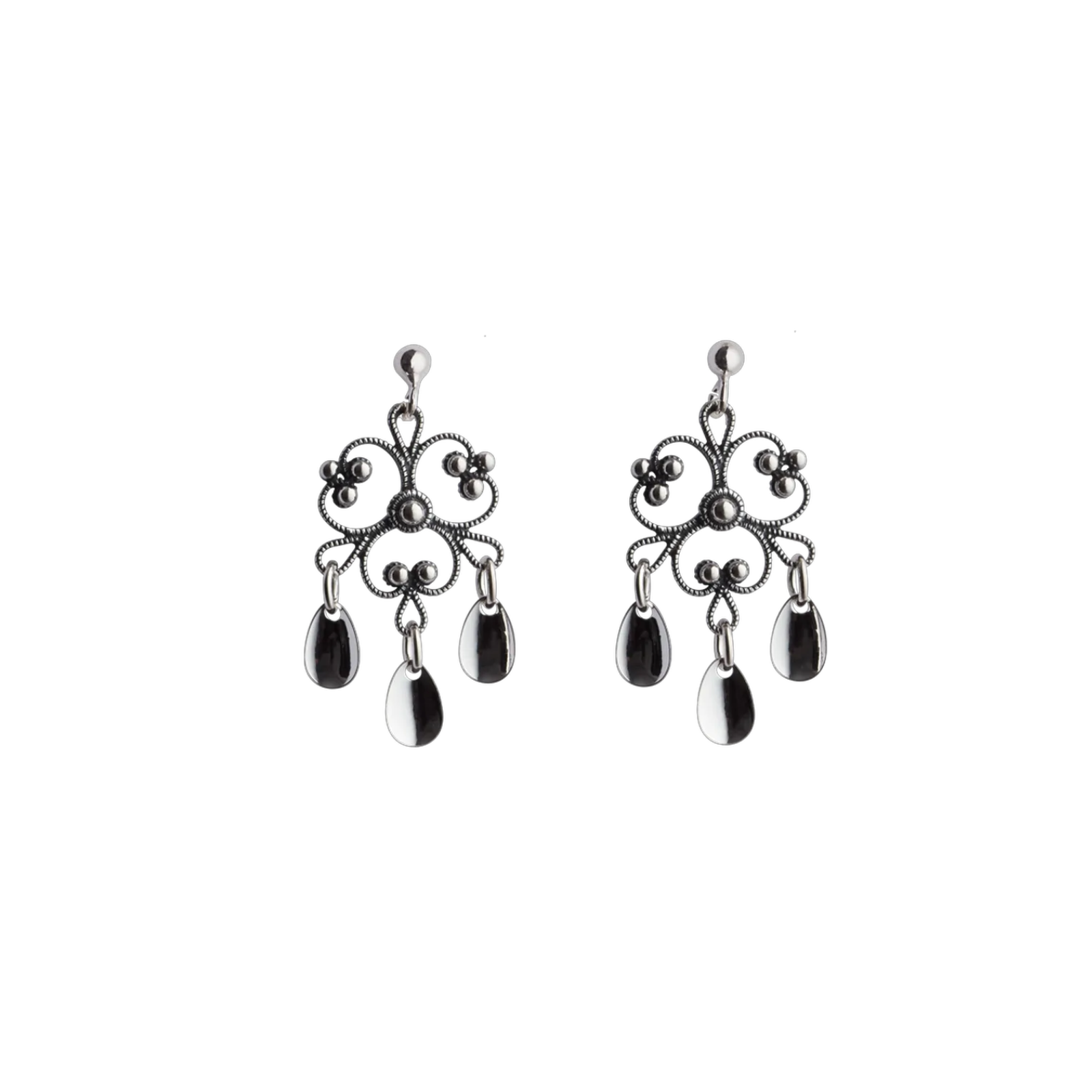 Nydelige, blomsterformede øredobber i oksidert sølv med tradisjonell filigrandekor og små, blanke drypplauv. Flott tilbehør til bunaden og ikke minst en fin gave til konfirmanten eller hun som har alt. Passer til alle bunader med oksidert bunadsølv.