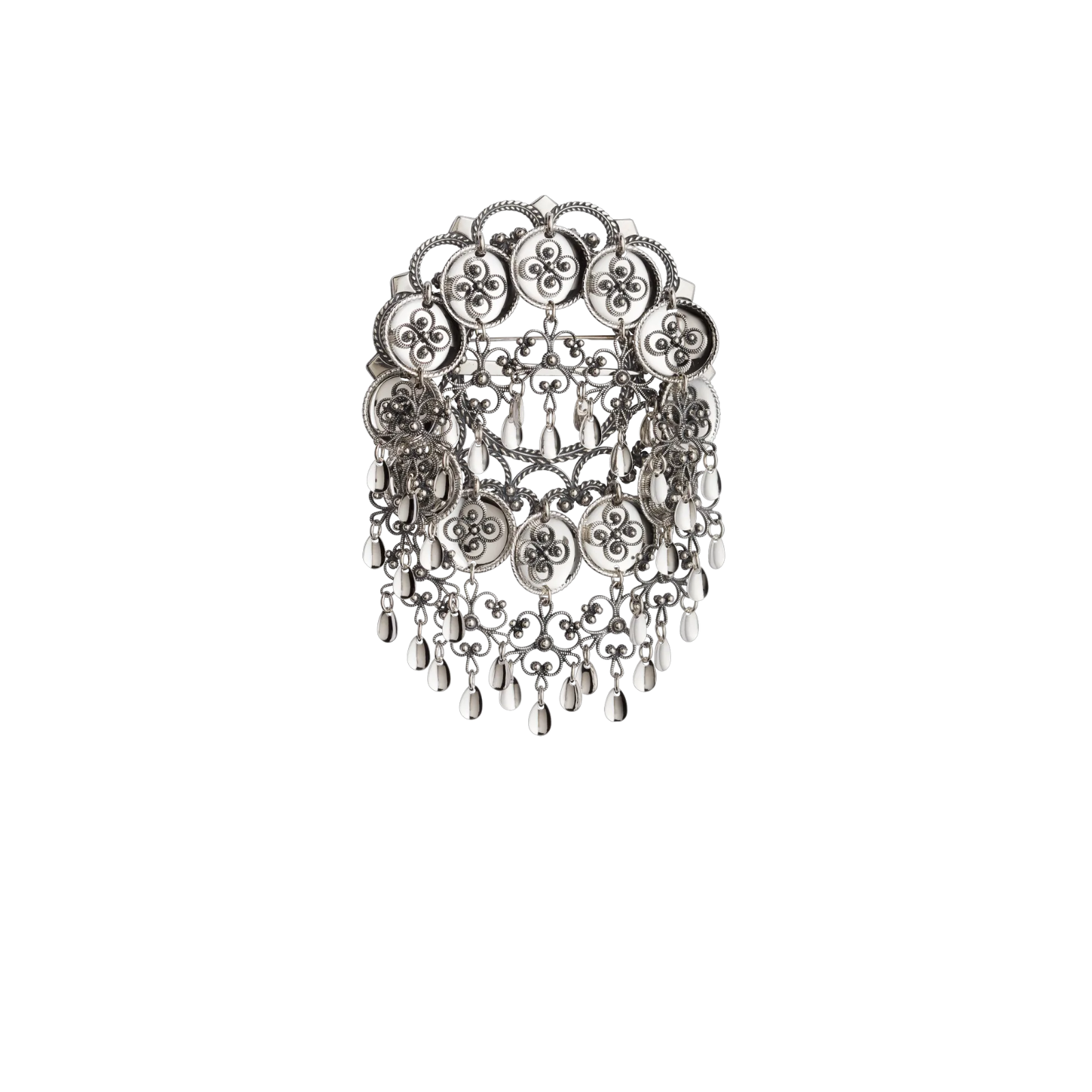 En flott sølje til Rogalandsbunaden. Den er laget i oksidert sølv med støpt bunn og nydelige heng med påloddet filigrandekor på trådkantlauvene.