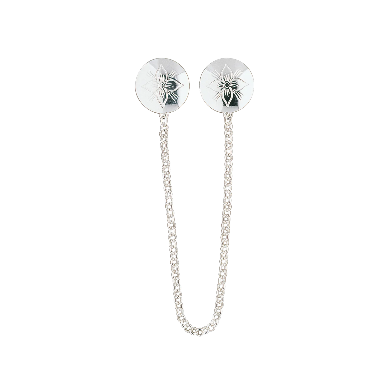 Nydelig og blankt sjalfeste i hvitt sølv til Rogalandsbunaden. Det har gravert dekor som harmonerer med det vakre florabroderiet på bunaden.