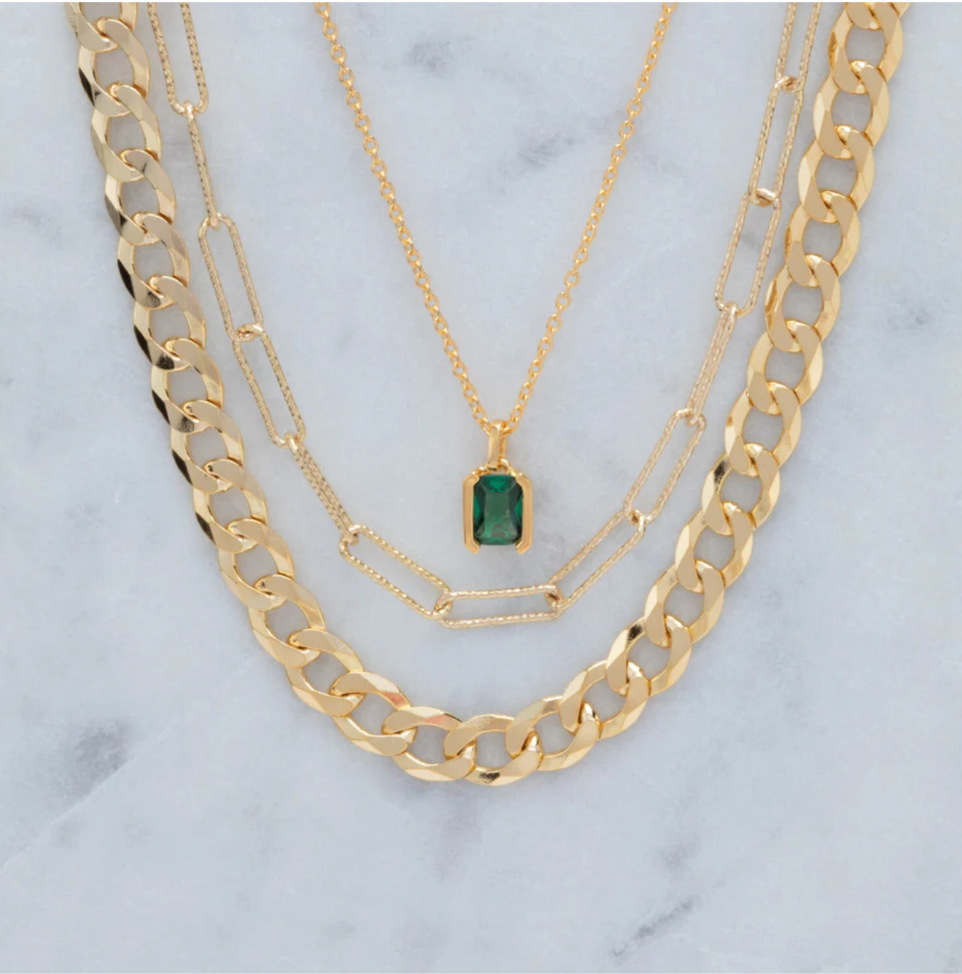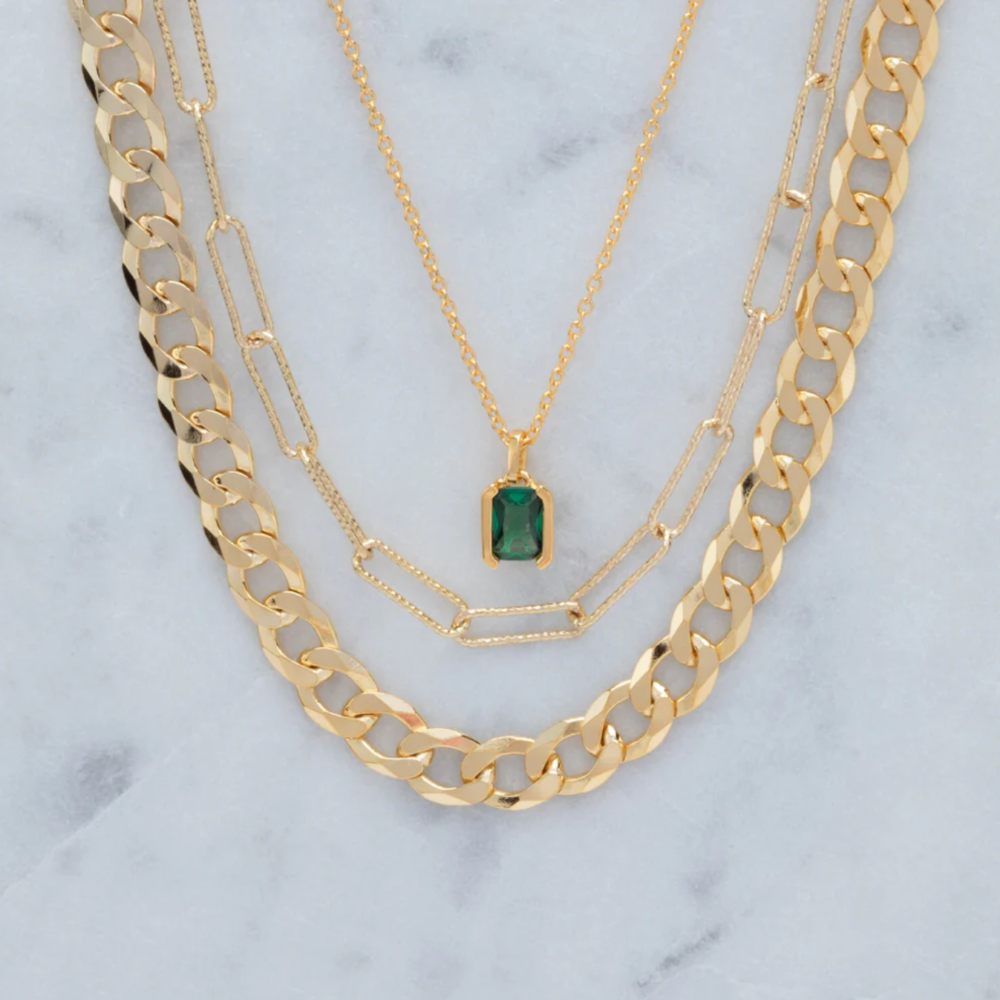 Halskjede laget av 18 karat gullbelagt 925 sterlingsølv, med en polert overflate og håndsatt med smaragdslipte grønne zirkonia.