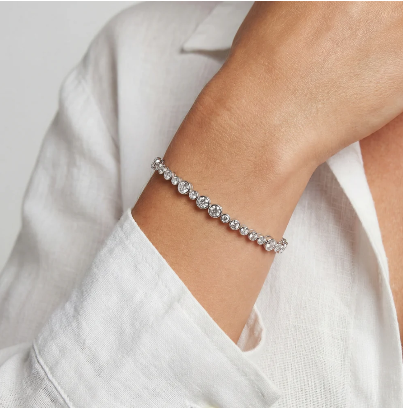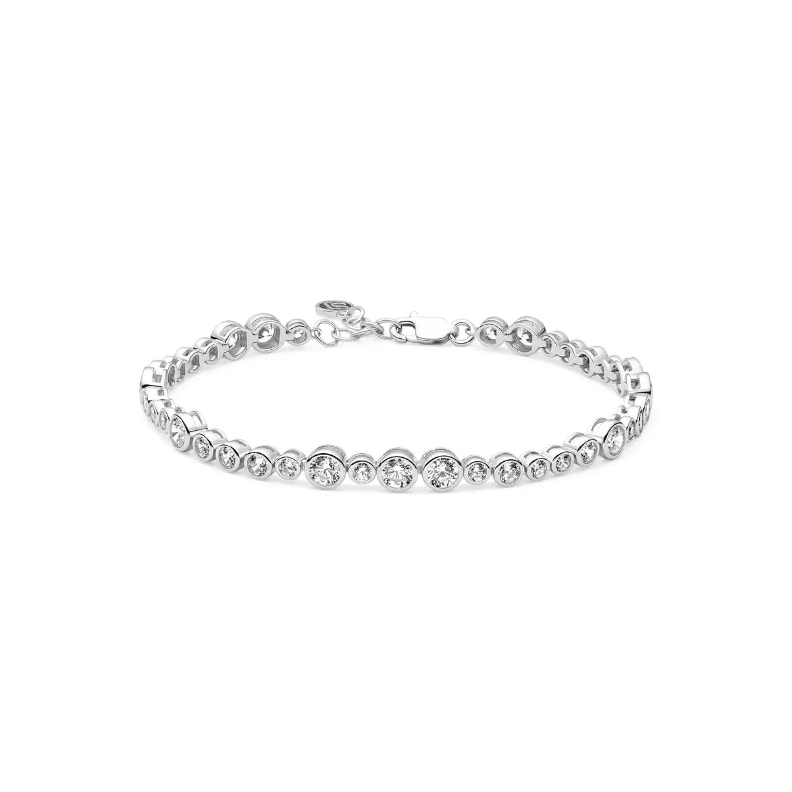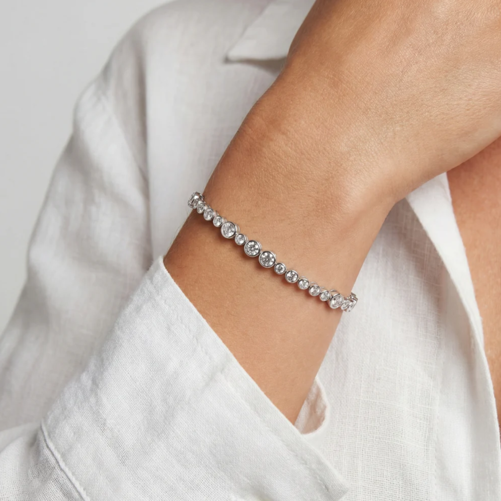 Dette armbåndet har et tidløst og elegant uttrykk, der de hvite zirkonia-steinene gir et vakkert og diskret skinn som minner om diamanter. Rhodineringen gir en ekstra slitesterk og glansfull overflate som beskytter mot anløpning og sørger for at smykket holder seg pent over tid.