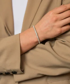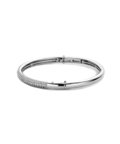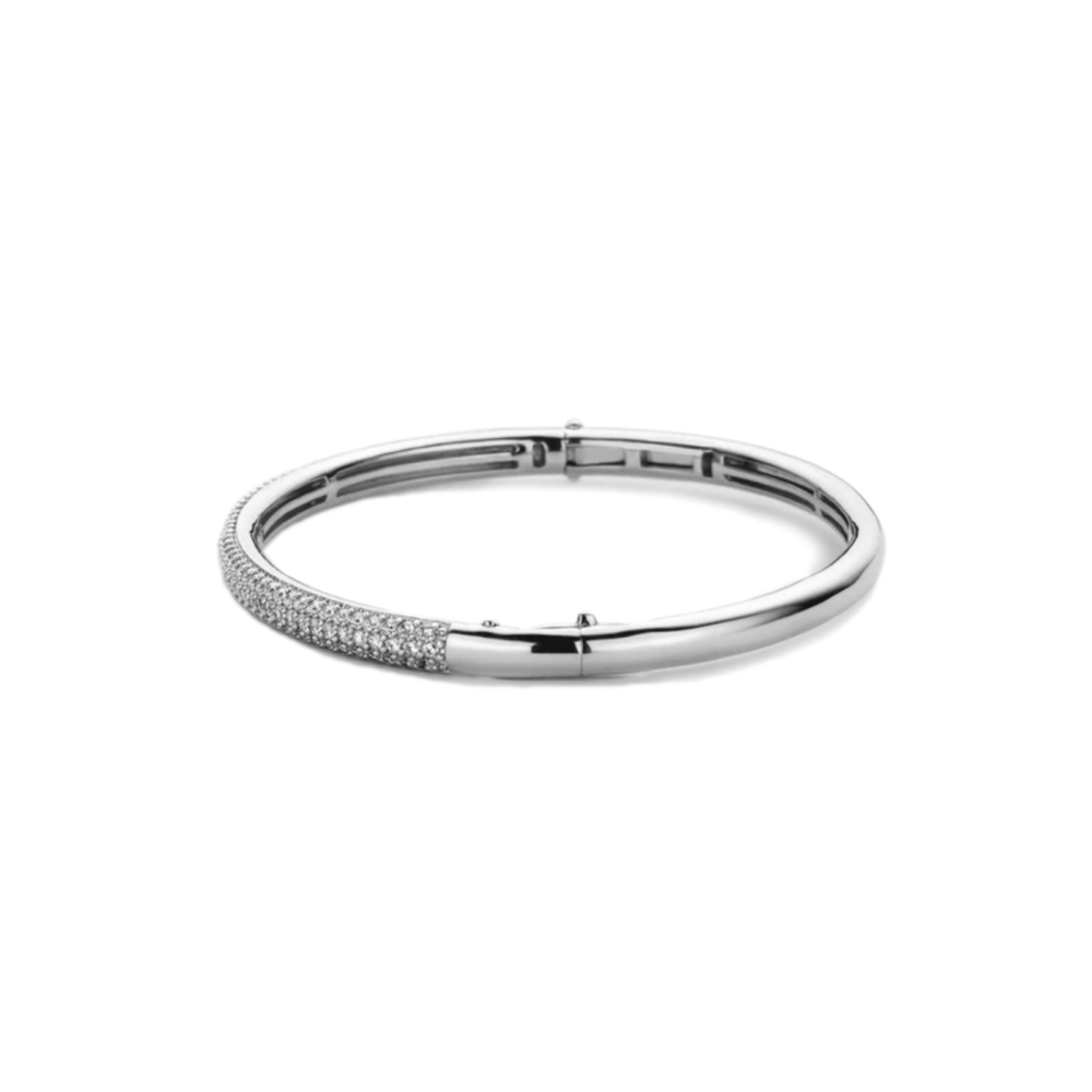 Ti Sento armring i sølv. Armringen er laget av rhodiumbelagt sølv og er satt med hvite zirkoner i den øvre kanten. Armringen er et must i smykkeskrinet. La det skinne alene eller kombiner med andre armbånd fra Ti Sento. Armringen er i strl s, som passer et håndledd som måler: 14.0cm – 15.5cm.
