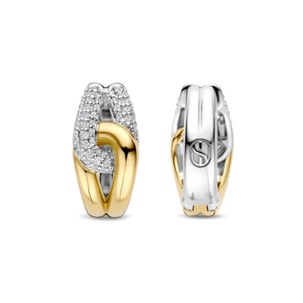 Sett deg i rampelyset med disse gullbelagte sølvøredobbene fra Ti Sento. Den ene siden gløder i høyglanspolert gult gull, mens den andre er belagt med platina og besatt med to buede rader med briljantslipte hvite zirkoner. Det flettede designet fanger lyset fra alle vinkler og tilbyr tekstur, gnist og raffinement i like stor grad. Disse øredobbene er nikkelfrie og hypoallergeniske, og er laget for luksus hele dagen.