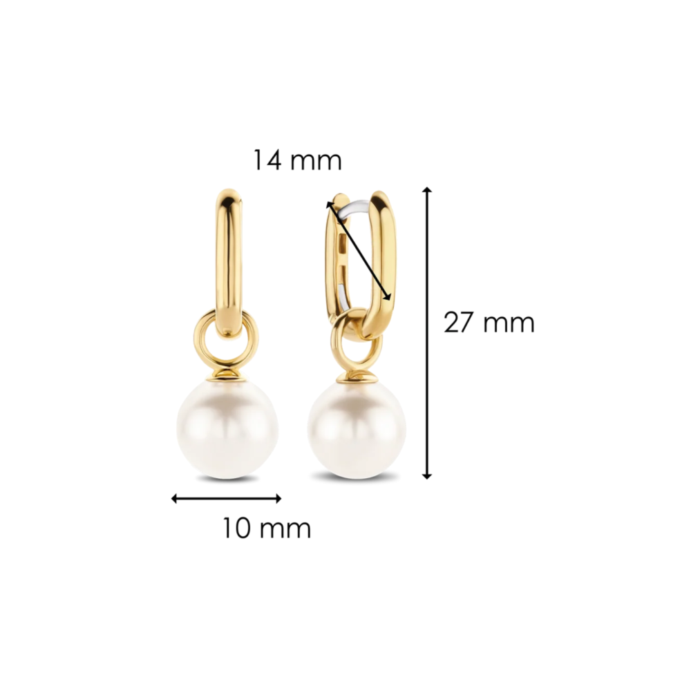 Disse TI SENTO gullbelagte sølvøredobbene har to skinnende hvite perler som henger i øreringene. Disse smykkene ble inspirert av sommeren på den solfylte øya Capri. De lekre hvite perlene utrykker eleganse og sikrer et sofistikert utseende. Kombiner med andre øreringer eller la dem skinne alene.