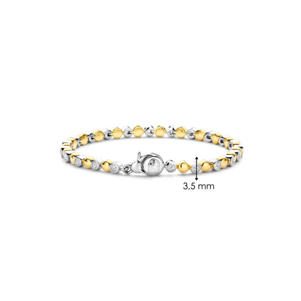 Omfavn sommervarmen med dette armbåndet i forgylt sølv fra Ti Sento. Laget av 925 sølv og belagt med premium platina for å beskytte det og holde det skinnende, har dette vakre armbåndet et fengslende samspill av gult gullbelagte dråpeformet ledd vekslende med glitrende hvite zirkoner satt i sølvfatninger.