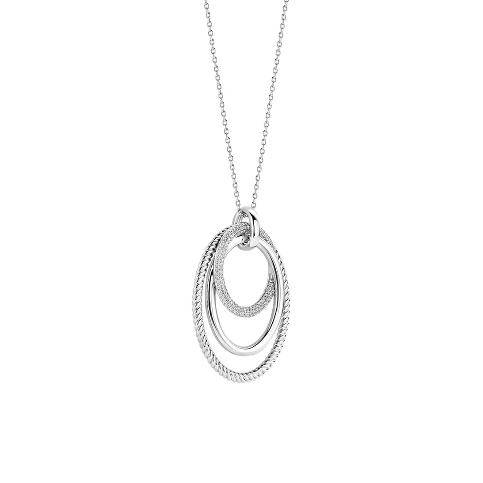 Kjedet består av sammenvevde sirkler med ulike teksturer – en ribbet ytterring, en glatt midtseksjon og en mindre ring dekorert med glitrende zirkonia-steiner. Denne kombinasjonen av former og overflater gir et dynamisk og elegant uttrykk som reflekterer lys på en sofistikert måte.