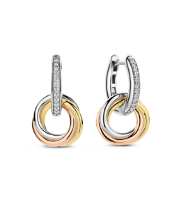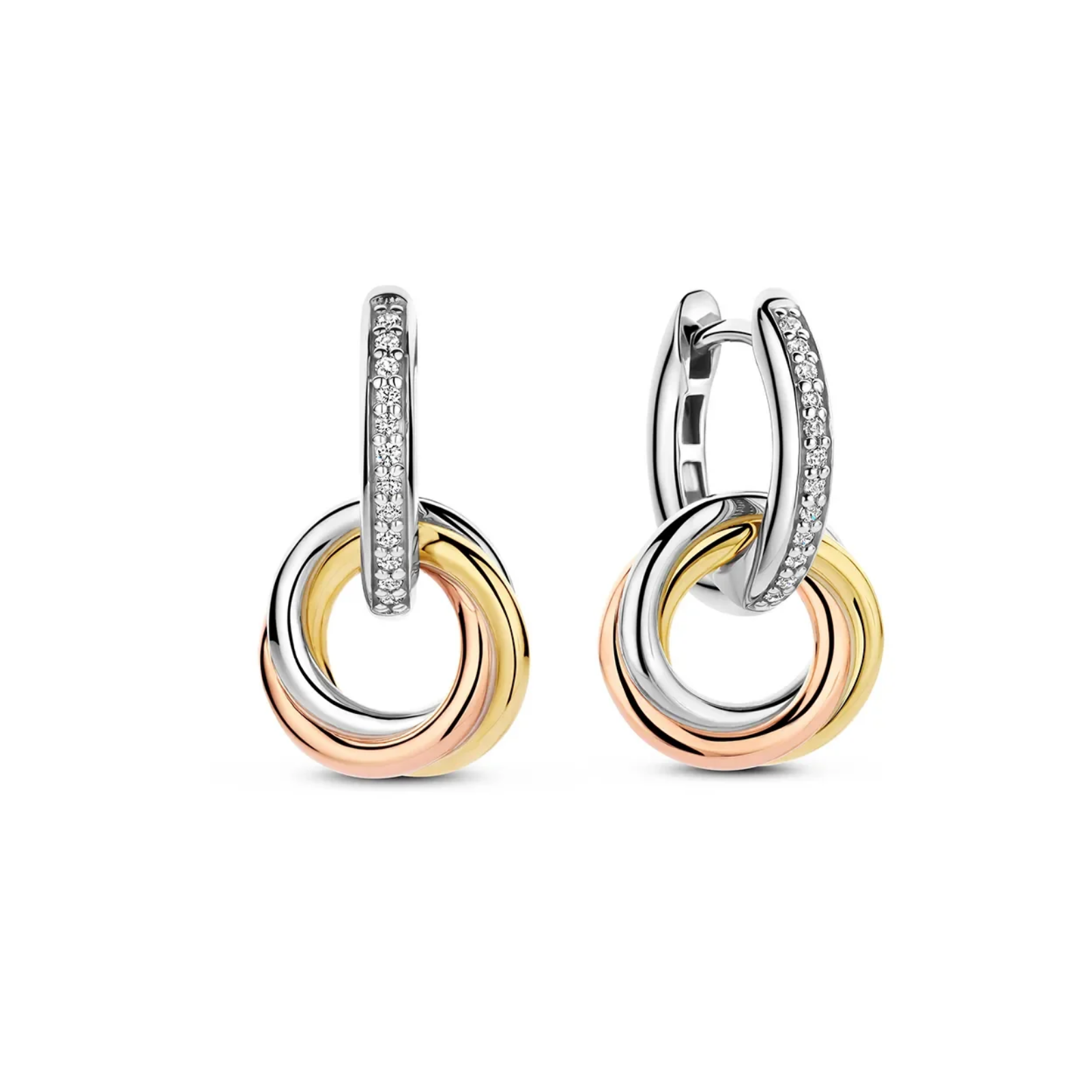 Disse TI SENTO sølvøredobbene har tre elegante sirkler med vridde linjer som henger fra små ringer med en pavé av zirkoner. Øredobbene er laget av sølv og belagt med et lag rosegull, gult gull og platina for å beskytte dem og holde dem skinnende. Disse tidløse smykkene vil gi antrekket ditt et snev av edgy eleganse.