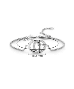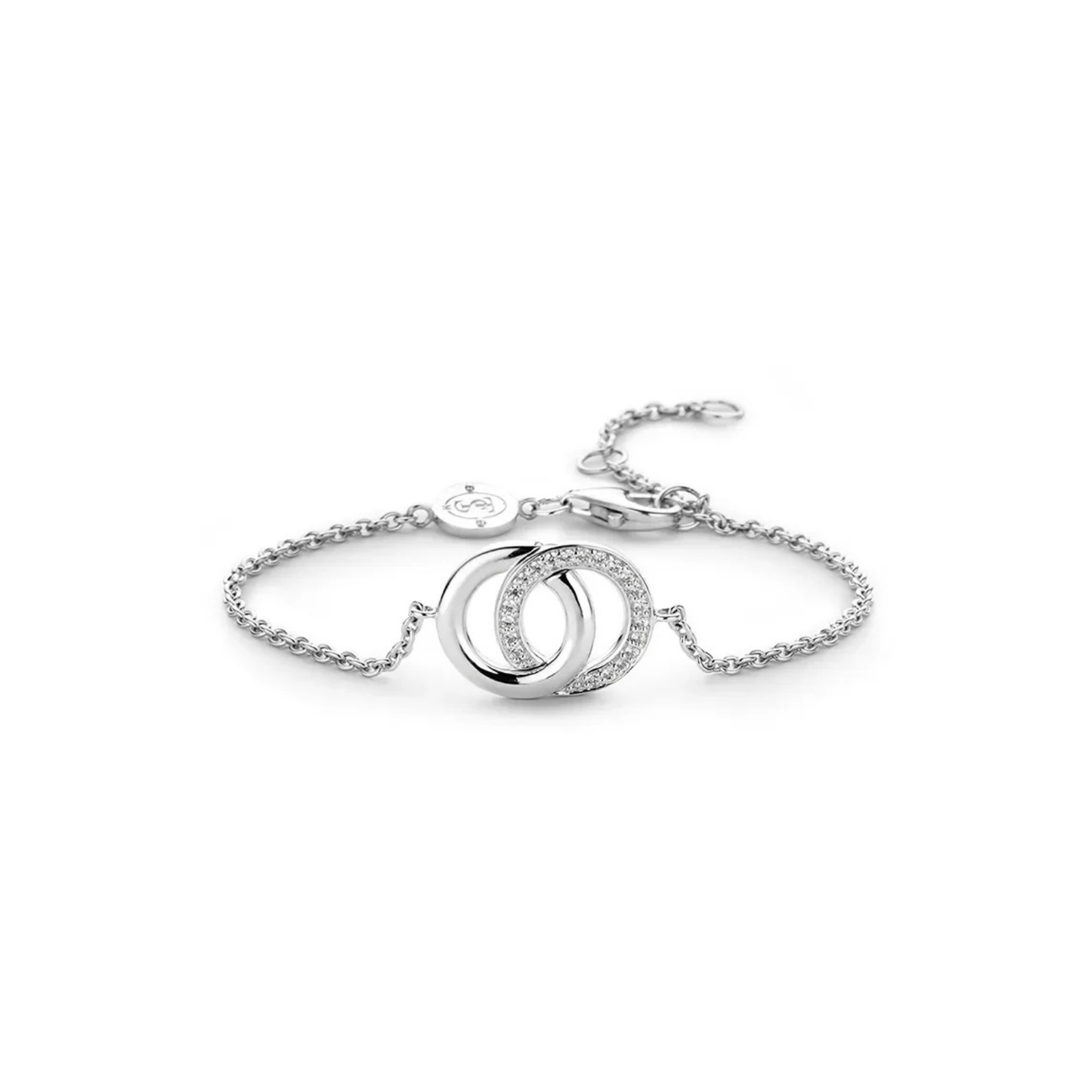 Ti Sento vennskapsarmbånd. Armbåndet er laget av rhodiumbelagt 925 sølv. Midt på armbåndet er det to flettede sirkler: en i glatt sølv, den andre besatt med zirkoner. Armbåndet kan justeres til ønsket lengde ved hjelp av forlengelsen på låsen.